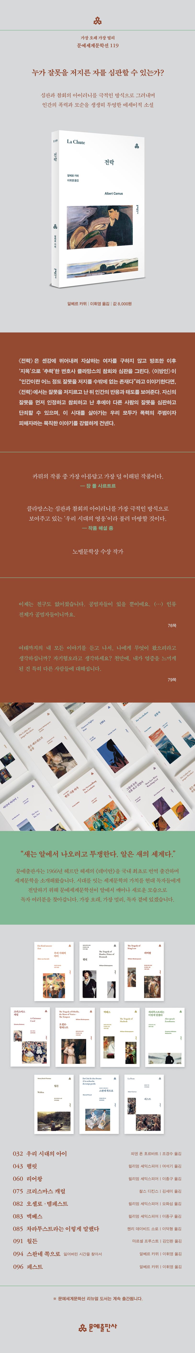 소설, 희곡, 철학적 에세이의 성격을 모두 담고 있는 이 작품은 카뮈의 만학과 사유를 뚜렷하게 보여주며, 그의 노벨문학상 수상에 적지 않은 영향을 미쳤다. 《이방인》이 “인간이란 어느 정도 잘못을 저지를 수밖에 없는 존재다”라고 이야기한다면, 《전락》에서는 잘못을 저지르고 난 뒤 인간의 반응과 태도를 보여준다. 자신의 잘못을 먼저 인정하고 참회하고 난 후에야 다른 사람의 잘못을 심판하고 단죄할 수 있으며, 이 시대를 살아가는 우리 모두가 폭력의 주범이자 피해자라는 묵직한 이야기를 강렬하게 건넨다.