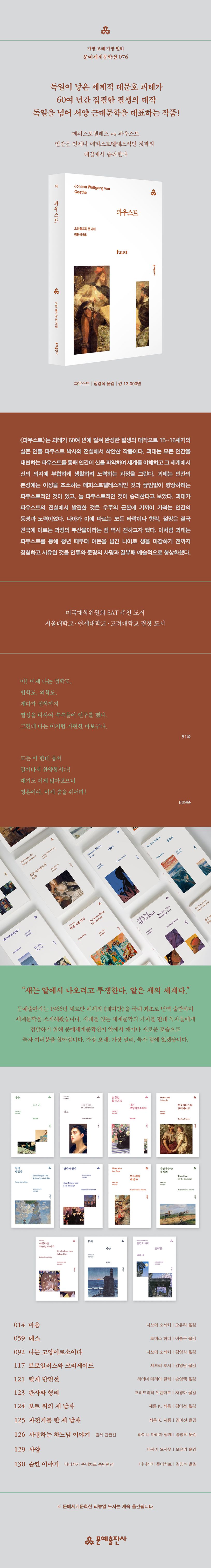 파우스트》는 세계적 대문호 괴테가 대학에 다니던 1773년 스물네 살의 나이에 쓰기 시작해 죽기 1년 전인 1831년까지 무려 60여 년간 써 내려간 필생의 대작이다. 문학 사조로는 독일적 개성 해방 운동인 ‘슈투름 운트 드랑(질풍노도)’과 고전주의, 낭만주의의 세 시대를 지나 완성된 작품이다. 괴테의 전 생애와 당대 문학 사조의 결정체라 할 수 있는 이 작품에서, 괴테가 천착한 것은 멸망하지 않고 구제되는 인간이었다.