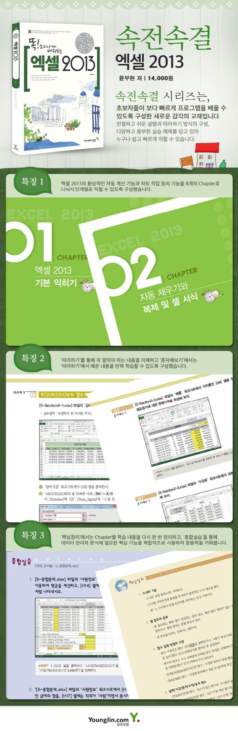 [똑! 소리나게 배워보는 속전속결 엑셀 2013]은 엑셀 2013의 핵심 기능부터 다양한 툴들의 사용법을 일목요연하게 정리하여 엑셀 2013을 처음 접하는 사용자들이 쉽게 예습/복습을 할 수 있도록 구성한 책이다. 엑셀 2013에 새롭게 추가되고 강화된 기능들과 실무에서 유용하게 사용하는 함수 등의 사용법 등을 여덟 개의 Chapter로 나눠서 단계별로 익힐 수 있도록 하고, 각각의 Chapter를 구성하는 ‘따라하기’를 수록해 학습할 수 있도록 했다. 또한, 혼자해보기, 핵심정리, 종합실습 등으로 배운 내용을 확인 해 볼 수 있다.