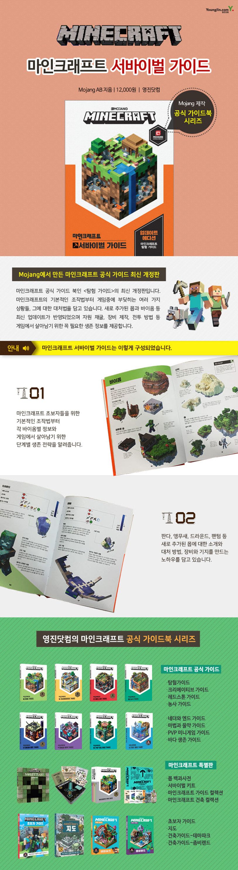 마인크래프트는 여러 가지 블록으로 이루어진 자원을 이용해 멋진 건축물을 만들거나, 무기를 만들어 적과 싸우는 등 다양한 활동을 할 수 있는 게임입니다. 전 세계 2억 명이 넘는 사용자와 수많은 커뮤니티를 갖고 있으며, 집중력과 창의력 등 교육적인 효과도 뛰어납니다. 이 책은 Mojang의 마인크래프트 개발자들이 만든 공식 가이드 시리즈로 게임에서 생존하기 위해 알아두어야 할 여러 가지 정보와 팁들로 가득합니다.