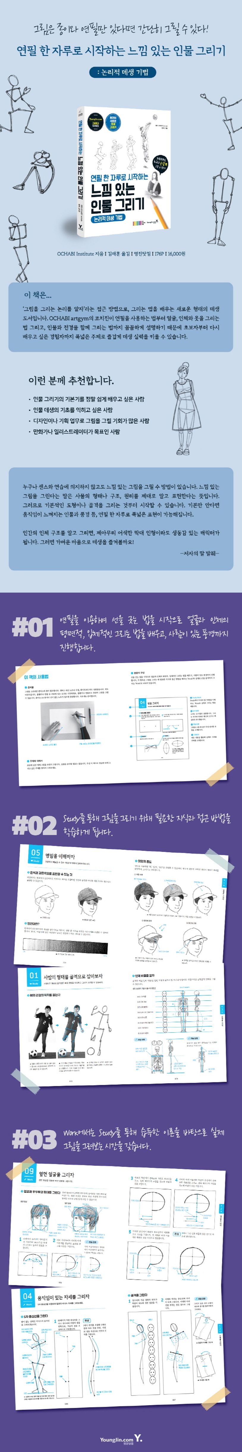 선을 긋는 법을 시작으로 인체의 평면적, 입체적으로 그리는 법을 배우고, 사람이 있는 풍경까지 그리는 방법을 알아봅니다. 그림 지식과 접근 방법을 알려주는 STUDY와 실제로 그리는 법을 알려주는 WORK로 구성된 이 책을 읽음으로써, ‘선’ 하나로 시작하여 빠르게 상상하는 인체를 그림으로 표현할 수 있게 될 것이며, 일정한 수준으로 구성이 갖춰진 그림도 그릴 수 있게 될 것입니다.