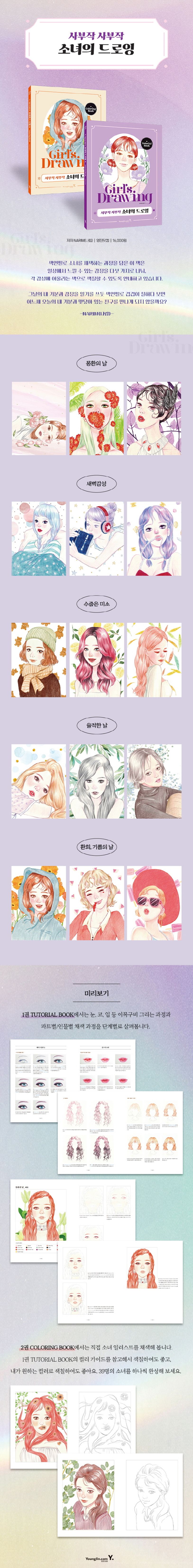 책은 Tutorial Book(튜토리얼북)과 Coloring Book(컬러링북) 총 2권으로 구성되어 있다. Tutorial Book은 눈, 코, 입, 두상 등 인물의 이목구비를 그리는 과정부터 시작해 메이크업 한 눈, 립스틱 표현, 다양한 헤어스타일 등 파트별 채색 과정과 인물별 채색 과정을 단계별로 안내한다. 2권 Coloring Book(컬러링북)은 원하는 대로 직접 채색해 볼 수 있도록 다양한 매력의 소녀 일러스트 39점을 담았다. 왼쪽에는 작가의 채색 일러스트를 제공해 채색 시 참고할 수 있도록 했으며, 180도로 쫙 펼쳐지는 특수 제본으로 보다 편하게 컬러링북을 즐길 수 있다.