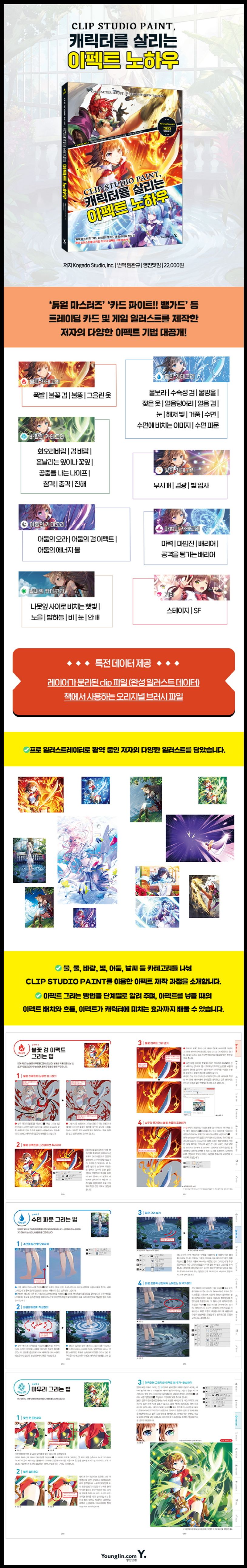 이펙트는 불, 물, 바람, 어둠, 날씨, 마무리 등 속성별로 나누어 소개하고 있습니다. 같은 일러스트에 다양한 이펙트를 적용하여 이펙트별 차이를 보여 주기도 하고, 마법 이펙트에는 마법사 일러스트를, 스테이지 이펙트에는 아이돌 일러스트를 사용하여 각각의 일러스트에 어울리는 이펙트 효과를 확인할 수 있도록 하였습니다. 또한, 단순히 이펙트의 한 가지 설명뿐만 아니라 이펙트를 어떤 흐름으로 어떻게 배치해야 하는지, 강약을 어느 정도로 넣어야 하는지, 이펙트가 캐릭터에 어떤 효과를 미치는지도 상세히 설명하고 있습니다.
