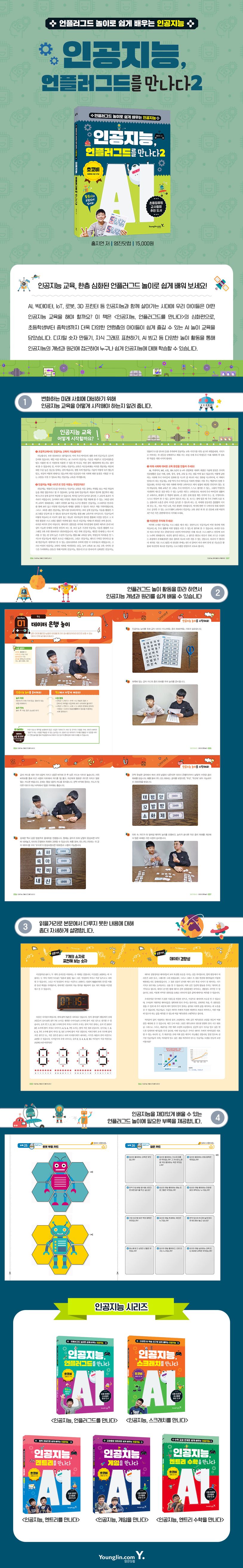 〈인공지능, 언플러그드를 만나다 2〉는 기존의 〈인공지능, 언플러그드를 만나다〉보다 더욱 다양하고 많은 연령층의 학생들을 대상으로 한층 심화된 AI 놀이 교육을 담아 학생들이 인공지능을 쉽게 즐길 수 있도록 하였습니다. 색종이로 디지털 숫자를 만들어 보며 컴퓨터가 문자나 숫자를 표현하는 방식을 배우고, 동물 카드를 특성에 따라 나누어 보며 인공지능의 군집화에 대해 배울 뿐만 아니라, 역할극으로 사람과 인공지능의 상호작용을 간접적으로 체험해 보는 등 놀이를 통해 기본적인 인공지능의 개념과 원리에 접근할 수 있습니다. 특별한 도구나 교구 없이 책에서 제공하는 부록을 가지고 놀이를 따라 하다 보면 인공지능에 대해 훨씬 친숙하게 느끼고 학습할 수 있습니다.