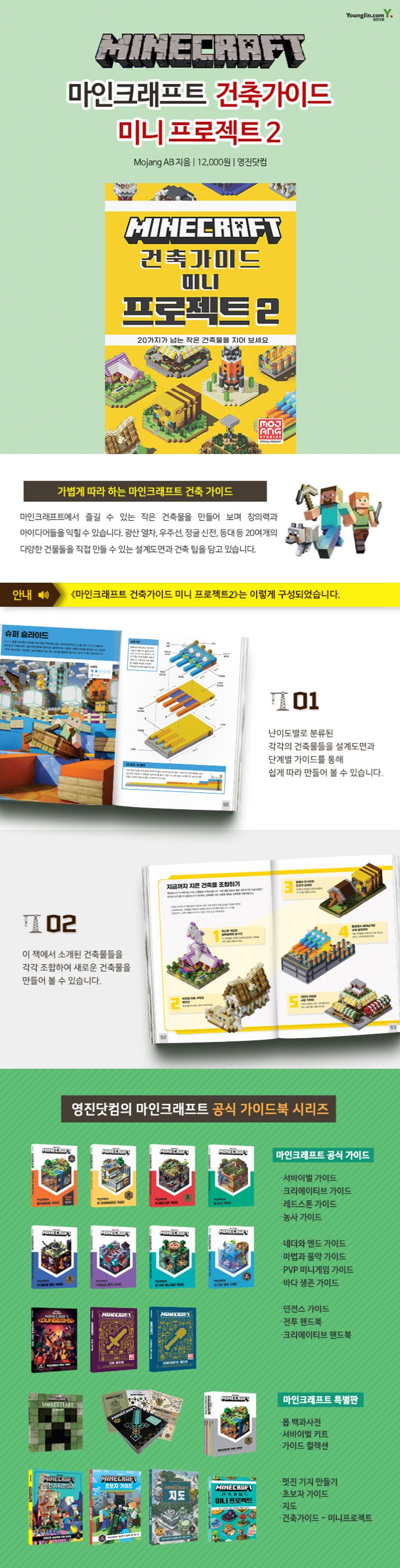 개성 넘치는 작은 건물을 짓는 방법에 대해 알려주는 마인크래프트 공식 가이드입니다. 전작에 이어 광산 열차, 우주선, 정글 신전, 등대와 해양 예인선까지 20개에 달하는 새로운 테마의 작은 건축 프로젝트를 담고 있습니다. 아직 건축에 익숙하지 않은 마인크래프트 초보자들을 위해 각 건물마다 자세한 설계도면과 단계별 가이드를 제공하여 쉽게 따라 할 수 있도록 구성되었습니다. 건물 내부에 쓰인 여러 가지 기능과 작동 원리, 건축 노하우를 담고 있으며 각각의 건축물들을 각각 조합하여 새로운 건축물을 만들어 볼 수도 있습니다. 이 책에서 소개하는 다양한 건축물을 기반으로 색다른 블록이나 새로운 디자인 등 창의력과 상상력을 더한 멋진 결과물을 만들 수 있을 것입니다.