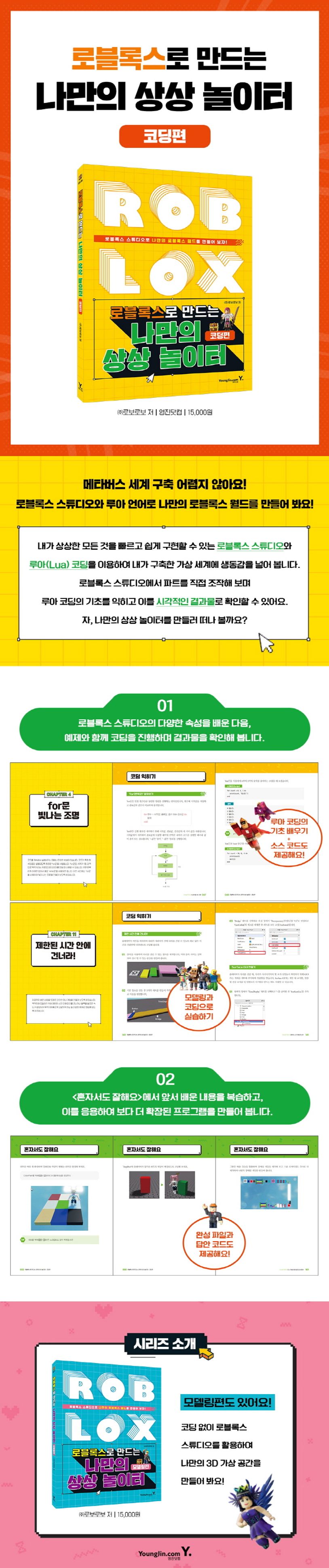 이 도서는 로블록스 스튜디오에서 다양한 파트를 직접 조작해 보며 '루아’의 기초 코딩을 재미있게 배울 수 있도록 구성했습니다. 색상이 계속해서 변하는 파트, 빛이 나는 파트, 특정 파트에 닿으면 색깔이 변하는 파트 등을 만들어 보면서 변수, 반복문, 조건문 등 루아의 기초 스크립팅을 배운 다음, 간단한 실습을 진행하여 이를 시각적인 결과물로 확인해 봅니다. 단계별로 이미지와 함께 차근차근 안내하고 있어 로블록스와 코딩을 처음 접하는 분들도 쉽게 따라 할 수 있으며, 각 챕터 마지막의 ‘혼자서도 잘해요’에서는 앞서 배운 내용을 응용하여 보다 더 확장된 프로그램을 만들 수 있습니다. 또한, 소스 코드와 완성 파일도 제공하고 있어 이를 참고하여 나만의 특별한 게임을 완성할 수 있습니다. 〈로블록스로 만드는 나만의 상상 놀이터〉와 함께 로블록스 월드를 만들어 보세요!