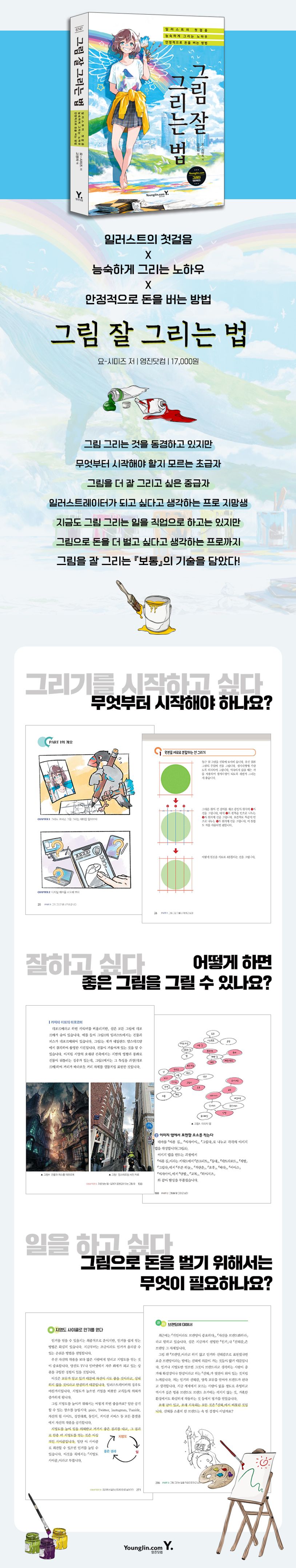 이 책은 그림 그리는 것을 동경하고 있지만 무엇부터 시작해야 할지 모르는 초급자, 그림을 더 잘 그리고 싶은 중급자, 일러스트레이터가 되고 싶다고 생각하는 프로 지망생, 지금도 그림 그리는 일을 직업으로 하고는 있지만 그림으로 돈을 더 벌고 싶다고 생각하는 프로까지 그림과 관련된 모든 고민을 안고 있는 사람들에게 현역으로 활동하고 있는 일러스트레이터의 경험을 살려 안내하는 도서입니다.