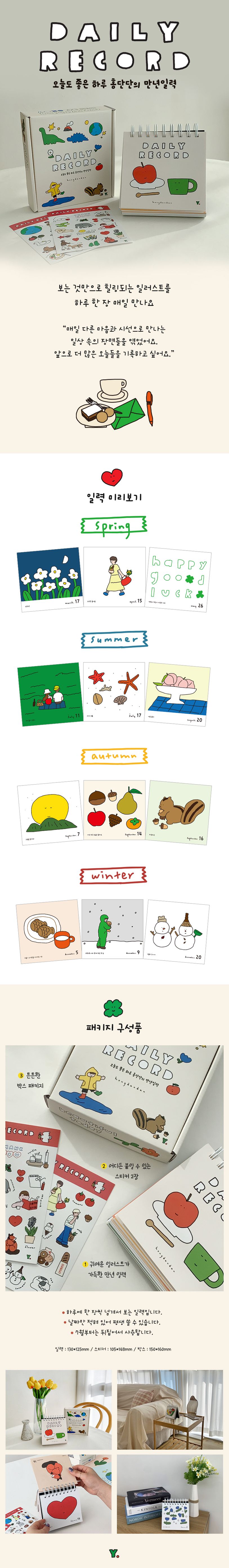 오늘은 일상에서 어떠한 것들을 마주했나요? 매일 다른 마음과 시선으로 만나는 일상 속 소소한 장면을 이젠 책상 위에서 만나 보세요. 일상의 다정하고 편안한 것들을 그림으로 그리는 홍단단 작가의 만년 일력 『DAILY RECORD』는 따스한 시선으로 바라본 자연, 사람, 동물 일러스트 366개를 담고 있습니다. 일력에는 날짜만 기재되어 있어 매년 계속해서 사용할 수 있으며, 튼튼한 박스 패키지로 연말연시 소중한 사람에게 마음을 전달하기에도 좋습니다. 일력을 매일 한 장 한 장 넘기며 우리 곁에 있는 작은 행복을 느껴 보세요.