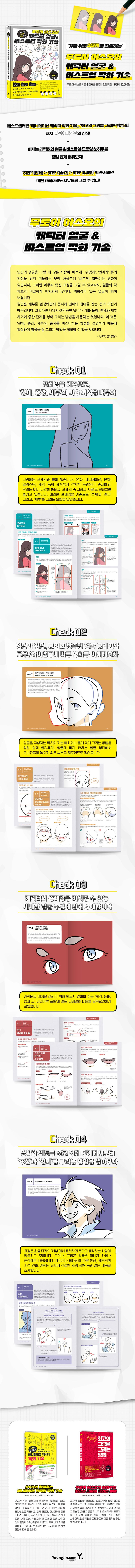 이 책 한 권이면 캐릭터의 얼굴 파츠와 머리카락, 목의 기본부터 남녀노소 구분하는 법, 성격 묘사, 희로애락 등의 감정 표현, 땀이나 눈물 등을 이용한 연출 기법까지 전부 배울 수 있다.
