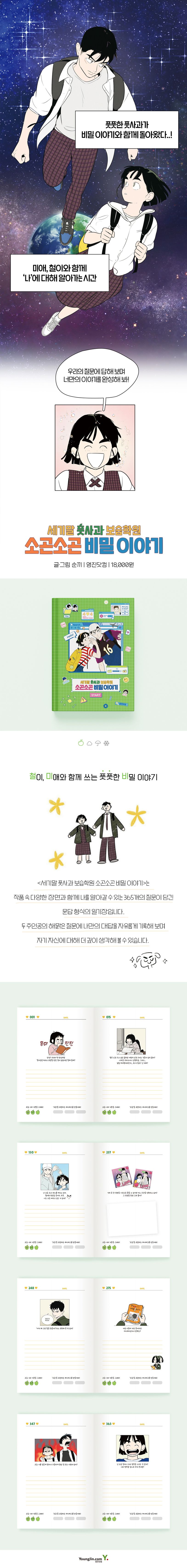 〈세기말 풋사과 보습학원 소곤소곤 비밀 이야기〉는 작품 속 다양한 장면과 함께 나를 알아 갈 수 있는 365개의 질문이 담긴 문답 형식의 일기장입니다. 철이와 같은 반이 되어 스트레스를 받는다는 미애의 질문에 나는 어떻게 스트레스를 푸는지, 미애와 모진섭의 모습을 보고 질투를 느낀다는 철이의 질문에 나도 질투를 느껴 본 적이 있는지 등 철이와 미애의 질문에 답하다 보면, 이들의 순수한 감정을 느낄 수 있을 뿐만 아니라 자기 자신에 대해 보다 깊이 생각할 수 있습니다. 스쳐 지나갈 뻔한 자신의 이야기와 소중한 추억을 한 권의 일기장으로 완성해 보세요.