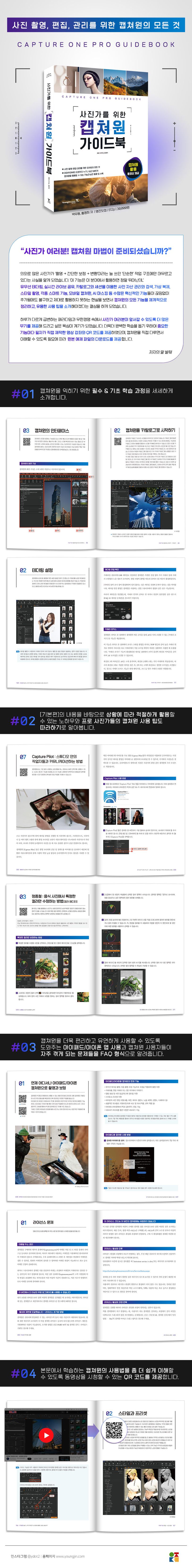 이 책은 이러한 캡쳐원의 모든 것을 소개하는 유일무이한 도서로서, [기본편]/[활용편]/[사용팁]/[부록편]/[FAQ]로 세분화하여 초보자부터 프로 사진가들의 활용 노하우까지 모두 학습할 수 있도록 구성했습니다. 또한, 해당 학습에 도움이 되는 관련 동영상을 시청할 수 있는 QR 코드를 도서에 삽입하여 캡쳐원을 더욱더 쉽게 자신의 것으로 만들 수 있도록 돕습니다.