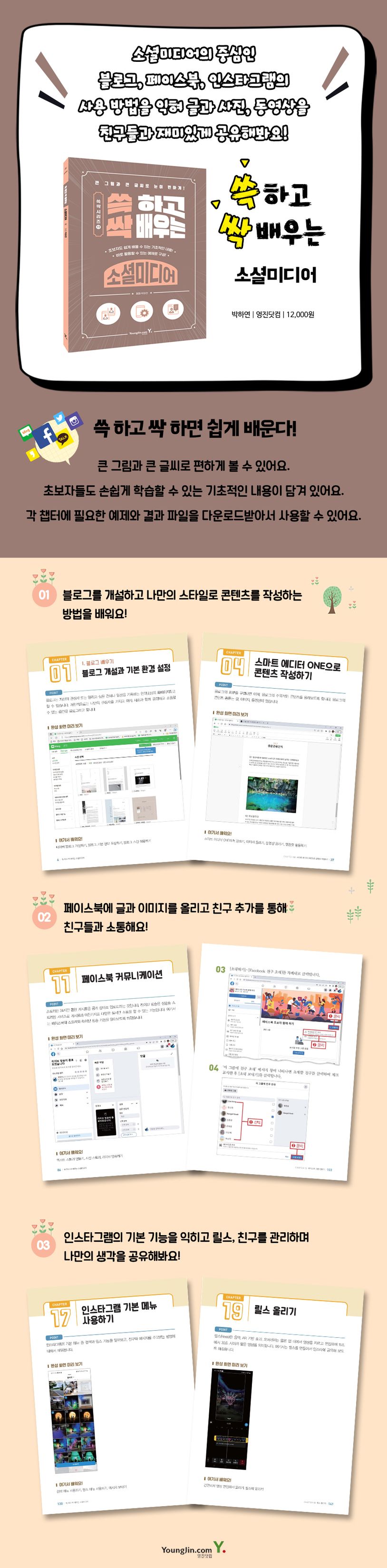 이 책은 블로그, 페이스북, 인스타그램 사용법을 익히며 나의 글과 사진을 친구들과 소통하는 방법을 배울 수 있는 도서입니다. 다양한 소셜미디어 사용법을 PC 버전과 모바일로 각각 익히며 온라인 소통을 즐겨보세요!