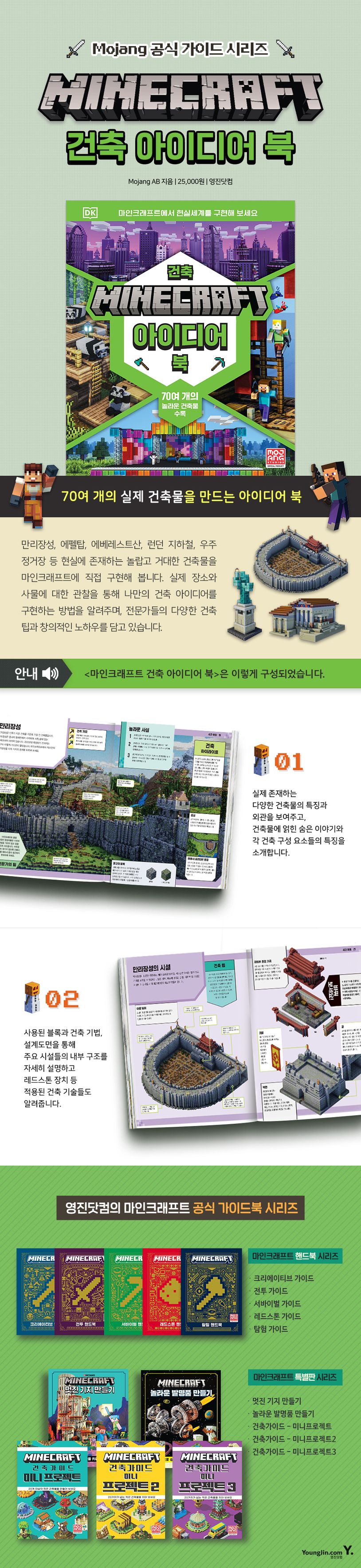 마인크래프트는 여러 가지 블록으로 이루어진 자원을 이용해 멋진 건축물을 만들거나, 무기를 만들어 적과 싸우는 등 다양한 활동을 할 수 있는 게임입니다. 전 세계 2억 명이 넘는 사용자와 수많은 커뮤니티를 갖고 있으며, 집중력과 창의력 등 교육적인 효과도 뛰어납니다. Mojang의 마인크래프트 전문가가 만든 이 책은 현실에 존재하는 놀랍고 거대한 건축물을 마인크래프트에서 직접 구현해 볼 수 있도록 다양한 건축 기술과 노하우를 담고 있습니다.