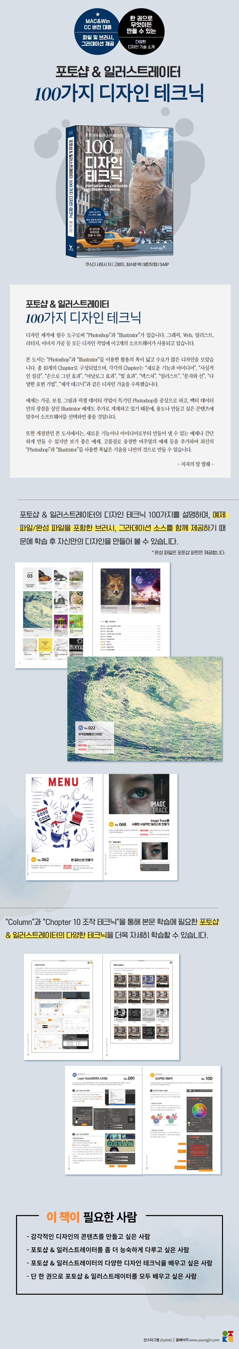 “포토샵 & 일러스트레이터 100가지 디자인 테크닉”은 그래픽, Web, 일러스트, 이미지 리터칭 및 합성 작업에 사용하는 대표적인 그래픽 프로그램인 Photoshop & Illustrator의 100가지 디자인 테크닉을 소개합니다. 쉽게 만들 수 있는 멋진 작품 예시부터, 사실적인 텍스처, 수작업 가공, 아날로그 가공, 빛 가공, 텍스처 제작, 일러스트 제작, 문자와 선의 배열, 조작 테크닉 등 이 책 한 권이면 무엇이든 만들 수 있습니다.