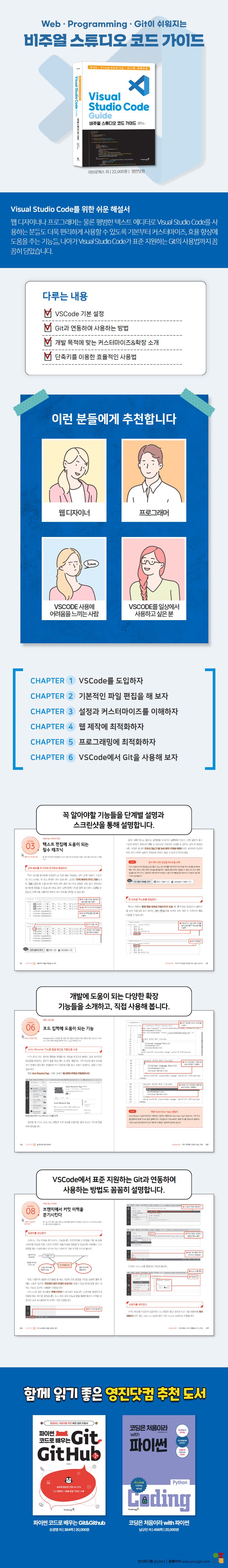 웹 디자이너나 프로그래머는 물론 평범한 텍스트 에디터로 Visual Studio Code를 사용하는 분들도 더욱 편리하게 사용할 수 있도록 기본부터 커스터마이즈, 효율 향상에 도움을 주는 기능들, 나아가 Visual Studio Code가 표준 지원하는 Git의 사용법까지 꼼꼼히 담았습니다.