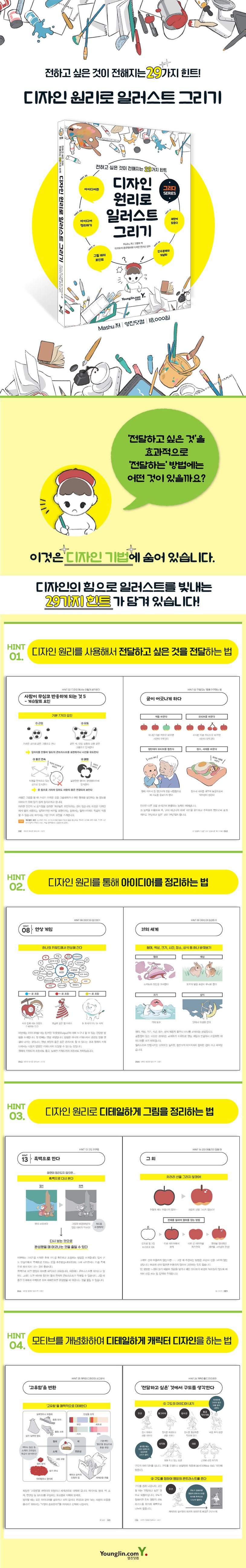 “생각대로 그릴 수가 없다.”, “아무리 그려도 실력이 늘지 않는다.”, “나는 센스가 없다.”.... 분명 처음 시작은 즐거운 일이었는데 이런 생각이 든다면 어떻게 해야 할까요? 이 책은 누구나 할 수 있는 ‘실력 향상을 위한 29가지 힌트’를 소개합니다. 아이디어부터 구도, 디테일 그리기, 색상 그리고 캐릭터 일러스트까지 ‘디자인’에는 그림에 적용할 수 있는 다양한 디자인 지식이 있습니다. 이 디자인 사고방식을 응용하여 전달하고 싶은 주제를 명확하고 쉽고, 효과적으로 전달할 수 있는 그리기 노하우를 알려줍니다.