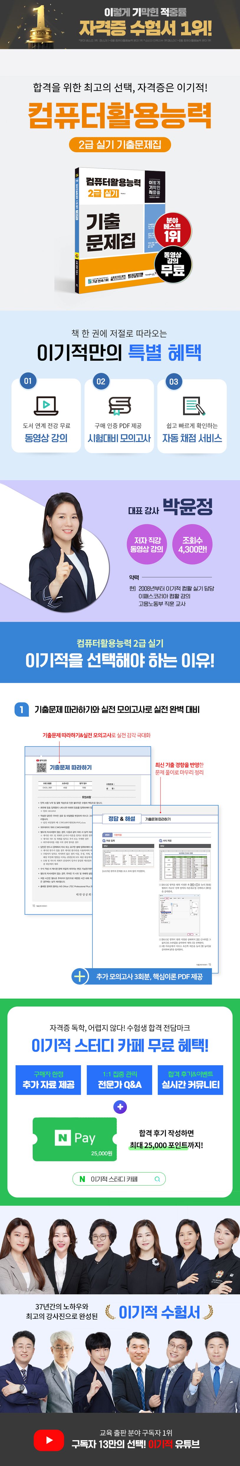 -무료동영상강의제공자격증실기시험은무조건문제를많이접해보고,많이따라해보는것이공부의지름길입니다.이과정에서수험생들이헤매지않고한번에기능을익힐수있도록무료동영상강의를제공합니다.동영상강의는PC뿐만아니라도서내QR코드를이용하여모바일로도손쉽게시청하실수있습니다.-자동채점프로그램제공감점사항을쏙~쏙~짚어주고인쇄기능까지제공합니다.-기출문제따라하기&실전모의고사총11회제공시험유형에대비하여기출문제따라하기1회,실전모의고사10회,시험대비모의고사3회를제공하여충분히문제를풀어볼수있습니다.-궁금증해결!이기적스터디카페영진닷컴은수험생여러분들의고충을덜어드리고자질문답변게시판을운영하고있습니다.공부하다막히는문제나혼자서해결하지못하는문제는이기적스터디카페(cafe.naver.com/yjbooks)에서문의해주세요.전문가로부터신속정확한답변을받을수있으며,실시간시험정보와후기등다양한혜택을제공받을수있습니다.