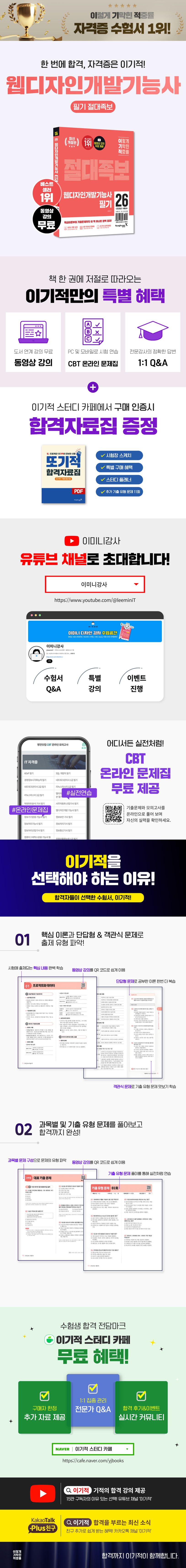 ‘2026 이기적 웹디자인개발기능사 필기 절대족보’ 도서가 출간되었습니다. 먼저 시험에 출제될 가능성이 높은 핵심이론 POINT 43을 엄선하여 무료 동영상 강의와 함께 학습할 수 있도록 구성했습니다. 학습 후 연계된 단답형&객관식 문제를 수록하여 순서대로 공부하기만 해도 풀이 방법을 빠르게 익힐 수 있습니다. 문제 풀이를 익혔다면, 마지막으로 기출 유형 문제 10회분을 통해 시험 직전 학습의 효과를 최대로 끌어올릴 수 있도록 하였습니다. 뿐만 아니라 카페를 통해 구매 인증을 진행하실 경우, 추가 기출 1회분이 포함된 ‘또기적 합격자료집(PDF)’을 무료로 제공하고 있습니다.