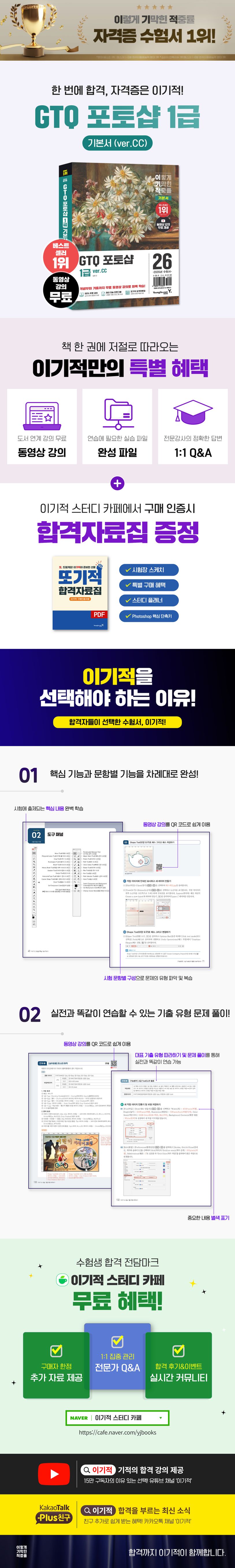 포토샵을 처음 접해보는 분들을 위해 프로그램에 대한 설명과 툴을 익힐 수 있도록 핵심 기능을 설명합니다. 또한 실제 시험의 문항별로 나오는 기능을 따라 익힐 수 있도록 자세한 설명을 진행하였습니다. 마지막으로 도서에 기재되어 있는 기출 유형 문제 10회분을 하나씩 풀어봄으로써 실제 시험에 충분히 대비할 수 있도록 준비하였습니다. 문제의 경우, 〈이기적 스터디 카페〉에서 구매 인증을 진행 시, 추가 기출 유형 문제 2회분 및 단축키 모음이 들어있는 또기적 합격자료집을 추가로 받아보실 수 있습니다. 시험에 합격할 때까지 홈페이지와 유튜브를 통해 저자가 직접 강의하는 무료 동영상 강좌까지 모두 제공받을 수 있습니다. 이기적은 여러분의 합격을 응원합니다!