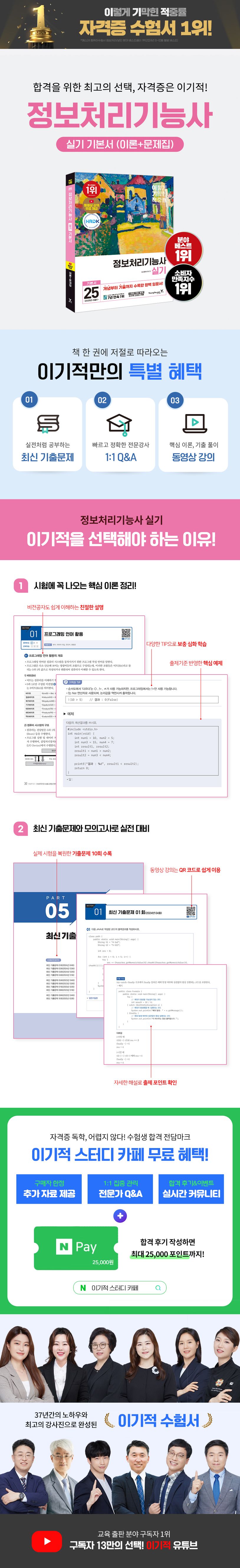 최신 출제기준을 적용한 도서로 정보처리기능사 실기 시험의 출제 경향을 분석하여 수험생들이 혼자서도 학습할 수 있도록 한 완벽 대비서이다. 시행처인 한국산업인력공단에서 공개한 출제기준을 바탕으로집필되었으며, 핵심 이론을 통해 기초 실력을 향상시키고, 최신 기출문제와 실전 모의고사로 시험에 철저하게 대비할 수 있도록 구성되었다. 또한 홈페이지에서 동영상 강의를 무료로 제공하여 완벽한 독학을돕고 있으며, 이기적 스터디 카페를 통해 추가 모의고사와 질문 답변 서비스도 이용할 수 있어 쉽게 시험을 준비할 수 있다.