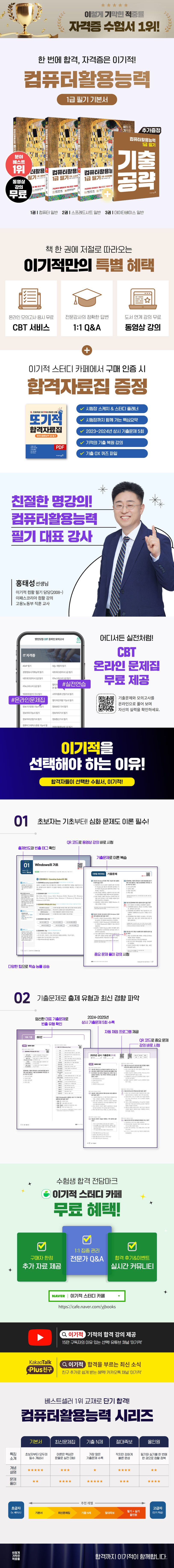 컴활 필기 시험을 준비하는 수험생이라면 필수인 책! 〈2026 이기적 컴퓨터활용능력 1급 필기 기본서〉가 출간되었습니다. 기본서는 3권의 이론서와 상시 기출문제를 담은 기출공략집까지 총 4권으로 구성되어 있습니다. 1권, 2권, 3권에서는 오랜 기간 출제 경향을 면밀히 분석하여 집필한 이론을 상세히 다룹니다. 각 파트와 섹션별로는 출제 빈도를 표기해, 수험생들이 효과적으로 학습을 진행할 수 있도록 구성하였고, 이론 학습 후 바로 기출문제를 통해 학습 내용을 확인할 수 있으며, 어려운 문제에 대해서는 추가적인 문제 풀이 동영상 강의로 확실한 이해를 도와드립니다. 4권의 기출공략집에서는 대표 기출 60선과 2024~2025년의 상시 기출문제를 제공하여 자주 출제되는 문제와 최신 경향의 문제로 실제 시험에 착실히 대비할 수 있습니다.
