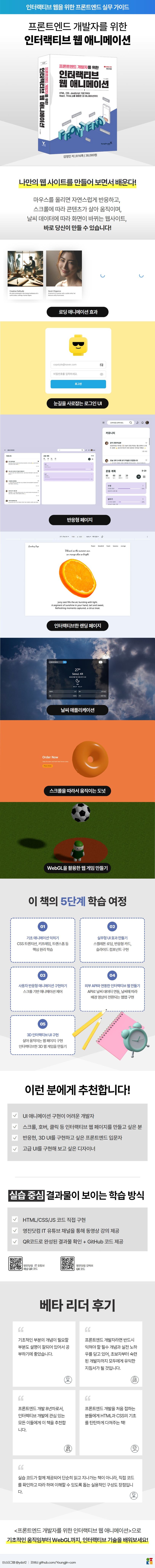 이책은단순히문법을배우는데서멈추지않고,실제로웹사이트에적용되는로딩화면,카드리스트,반응형레이아웃같은실무에서자주쓰이는UI구성요소를직접구현해보며애니메이션개념을익히도록구성되어있습니다.