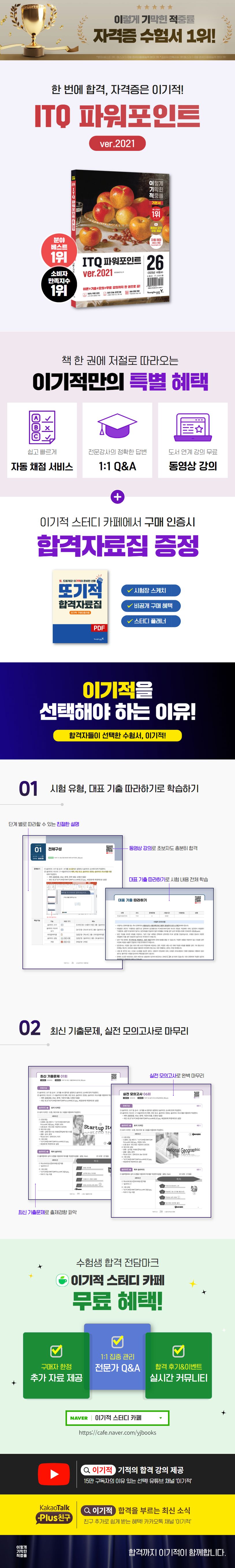 〈2026 이기적 ITQ 파워포인트 ver.2021〉은 최신 출제기준을 적용한 도서로, ITQ 파워포인트 시험 경향을 분석하여 수험생들이 혼자서도 학습할 수 있도록 한 완벽 대비서입니다. 본 수험서의 시험 유형 따라하기와 대표 기출 따라하기를 통해 기초 실력을 향상시킬 수 있고, 최신 기출문제 10회와 실전 모의고사 10회로 실전에 철저하게 대비할 수 있습니다. 또한 무료로 제공되는 동영상 강의로 초보자도 쉽게 독학할 수 있도록 했으며, 또기적 합격자료집, 답안 작성 프로그램, 자동 채점 서비스(일부 회차 시범 제공) 등의 다양한 부가자료를 제공하고 있습니다.