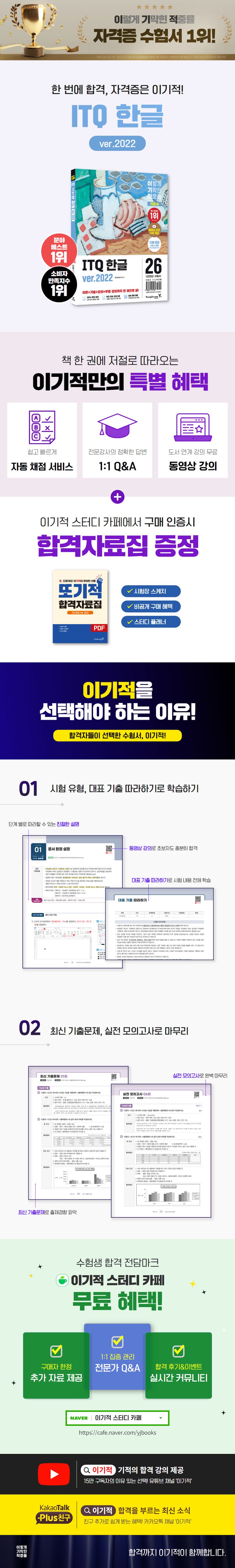 〈2026 이기적 ITQ 한글 ver.2022〉는 최신 출제기준을 적용한 도서로, ITQ 한글 시험 경향을 분석하여 수험생들이 혼자서도 학습할 수 있도록 한 완벽 대비서입니다. 본 수험서의 시험 유형 따라하기와 대표 기출 따라하기를 통해 기초 실력을 향상시킬 수 있고, 최신 기출문제 10회와 실전 모의고사 10회로 실전에 철저하게 대비할 수 있습니다. 또한 무료로 제공되는 동영상 강의로 초보자도 쉽게 독학할 수 있도록 했으며, 또기적 합격자료집, 답안 작성 프로그램, 자동 채점 서비스(일부 회차 시범 제공) 등의 다양한 부가자료를 제공하고 있습니다.