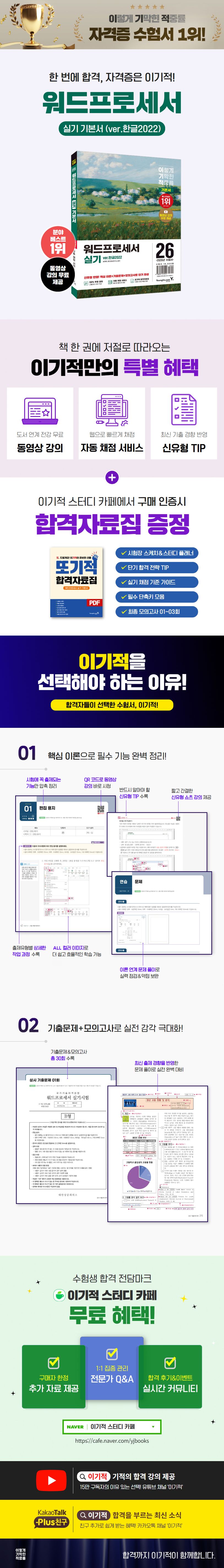 〈2026 이기적 워드프로세서 실기 기본서〉는 단기간에 시험에 합격할 수 있도록, 핵심 이론부터 기출문제, 모의고사까지 한 권에 모두 담았습니다. 실제 시험에 꼭 출제되는 필수 기능을 빠르고 확실하게 정리하고, 기출문제 15회+모의고사 15회, 총 30회분의 풍부한 문제 풀이로 실전 감각을 극대화할 수 있습니다. ALL 컬러 이미지로 더 쉽고 효율적인 학습이 가능하며, QR 코드로 고퀄리티 동영상 강의를 편리하게 시청할 수 있습니다. 최근 시험 후기 분석을 통해 반드시 알아야 할 신유형 기능만을 선별하여 교재 내 ‘신유형 TIP’으로 수록했으며, 짧고 간결한 쇼츠 강의까지 무료로 제공합니다. 또한 별도의 설치 없이 이용 가능한 ‘웹 자동 채점 서비스’로 빠르게 채점 결과를 확인하고 부족한 부분은 즉시 보완할 수 있습니다. 교재만 구매하면 구매 인증을 통해 특별 제공되는 ‘또기적 합격자료집(PDF)’으로 시험 전까지 완벽한 대비가 가능합니다.