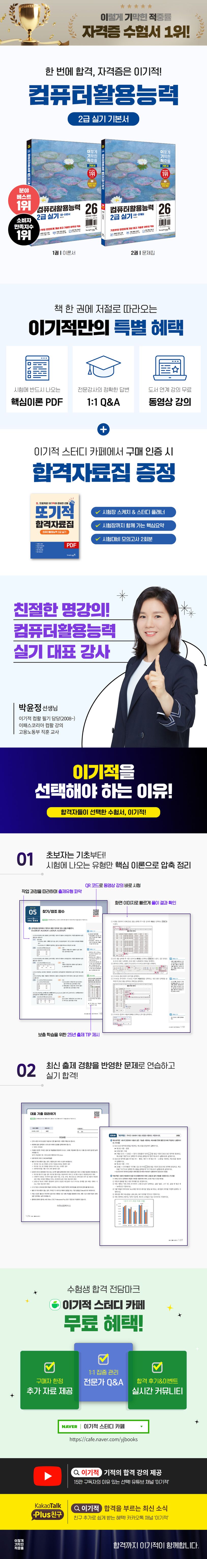 [2026 이기적 컴퓨터활용능력 2급 실기 기본서] 도서가 출간되었습니다. 출제기준을 분석, 반영하여 컴퓨터활용능력 실기 시험에 대비할 수 있도록 구성하였습니다. 1권의 이론서에서 핵심이론과 함수사전을 공부한 후, 2권의 문제집에서 상시 기출 문제&기출 유형 문제를 풀어보세요. 이기적은 여러분의 합격을 응원합니다!