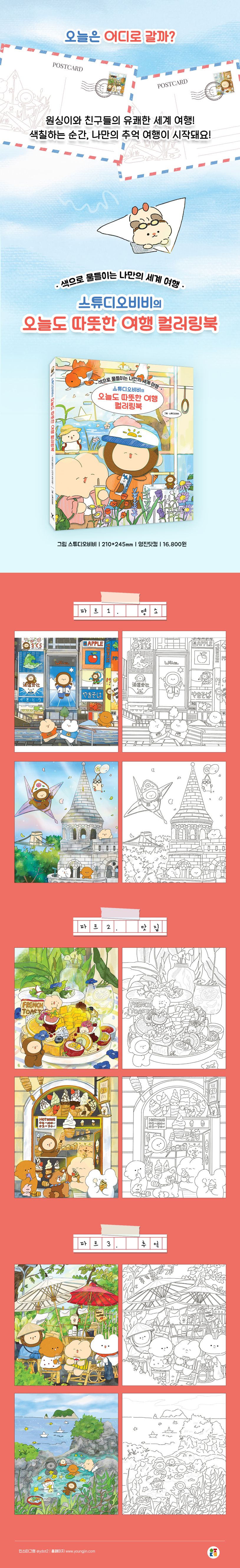 원싱이와 친구들이 함께 떠난 사계절 여행 이야기를 담은 『스튜디오비비의 오늘도 따뜻한 여행 컬러링북』은 작가가 다녀온 여러 나라의 풍경과 추억을 바탕으로, 각 도시의 감성과 순간을 그림으로 그려 냈습니다. 도쿄, 헝가리, 태국, 홍콩, 삿포로 등 계절을 따라 펼쳐지는 다양한 여행지에서 친구들이 마주한 풍경과 에피소드 속에는 작가의 따스한 시선이 녹아 있습니다. 그림을 따라 색을 입히다 보면, 마음속에 간직해 온 여행의 풍경이 하나의 장면으로 완성됩니다.