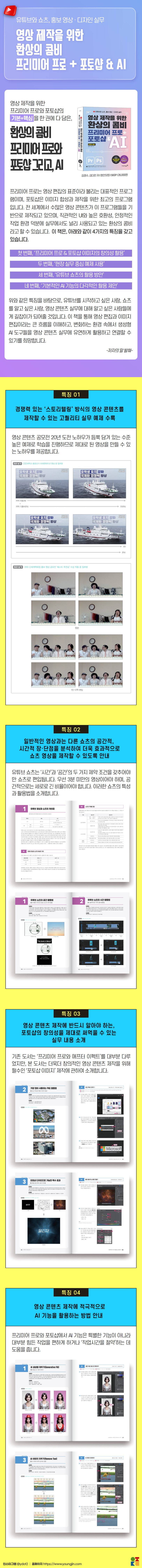 PART01.프리미어프로2025-영상편집의기준,기본부터실전까지PART01은프리미어프로2025의핵심기능을중심으로,영상편집의기초부터실무에바로적용가능한테크닉까지폭넓게다룹니다.변화된UI흐름과단축키,생성형AI도구를소개하며,실무에서자주쓰이는기능만을골라실용적으로정리했습니다.특히최근콘텐츠흐름의중심인유튜브쇼츠제작법을별도Chapter로다뤄,화면구성과자막디자인,가로영상을세로쇼츠로바꾸는편집기법,타임랩스·슬로우모션활용등짧고강렬한영상기획에필요한핵심노하우를간결하게정리했습니다.기초와실전,그리고트렌드까지모두담은이PART는영상제작의출발선이자실전도약의발판이될것입니다.PART02.포토샵2025+AI영상의완성도를높이는이미지창의성포토샵은단순한이미지편집도구가아닌,영상콘텐츠의시각적완성도를좌우하는핵심도구입니다.PART02에서는영상속이미지의중요성에주목하며,섬네일제작,화면구성,시선유도등다양한시각요소를실무예제중심으로다룹니다.특히최근강화된AI기능인‘생성형채우기(GenerativeFill)를활용한색다른이미지생성’,‘생성형확장(GenerativeExpand)을통한화면확대및보완’,‘이미지지우기(RemoveTool)로불필요한요소제거’등간단하지만강력한자동화기능들도함께소개합니다.기존영상편집책에서상대적으로소홀했던포토샵의역할을조명하며,영상콘텐츠에‘이미지기획력’을더할수있도록창의적이고전략적인접근법을제시합니다.