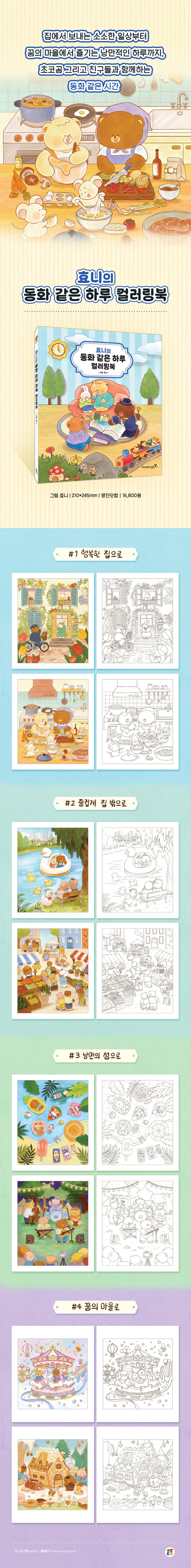 『효니의 동화 같은 하루 컬러링북』은 푸근하고 귀여운 곰돌이 초코곰과 친구들이 함께하는 따뜻한 하루를 그린 컬러링북입니다. 목욕, 요리, 독서처럼 평범한 일상부터, 관광지와 휴양지를 누비는 특별한 외출, 그리고 꿈속에서 펼쳐지는 달콤하고 낭만적인 상상의 마을까지, 다양한 공간과 순간이 작가 특유의 부드럽고 사랑스러운 감성으로 담겨 있습니다.