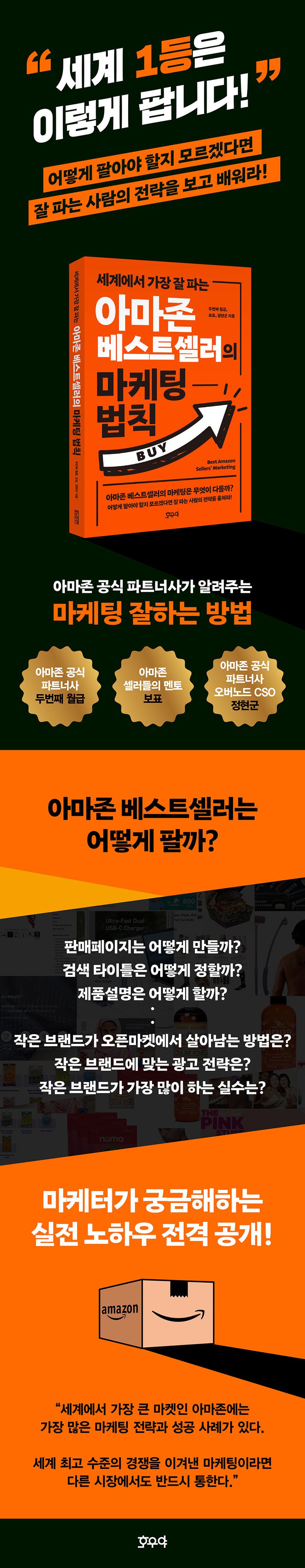 마케팅을 하다 보면 ‘왜 광고를 해도 매출이 늘지 않지?’ 하는 순간이 발생한다. 왜 안 팔릴까? 어떻게 하면 잘 팔 수 있을까? 마케팅을 잘하는 가장 쉽고 빠른 방법은 좋은 마케팅 사례를 많이 보는 것이다. 이 책에는 아마존에서 대기업 브랜드보다 더 강한 존재감을 가진 작은 브랜드들이 등장한다. 아마존 베스트셀러 제품들 중 가격이 가장 저렴한 제품과 대기업 브랜드 제품을 제외하고 오직 ‘마케팅력’으로 세계 정상에 오른 제품들이다. 어떻게 팔아야 할지 모르겠다면 잘 파는 사람의 전략을 보고 배워라. 1등에게는 1등이 된 이유가 있다. 분야가 달라도 상관없다. 저마다 파는 건 달라도 잘 파는 방법은 통하기 때문이다.