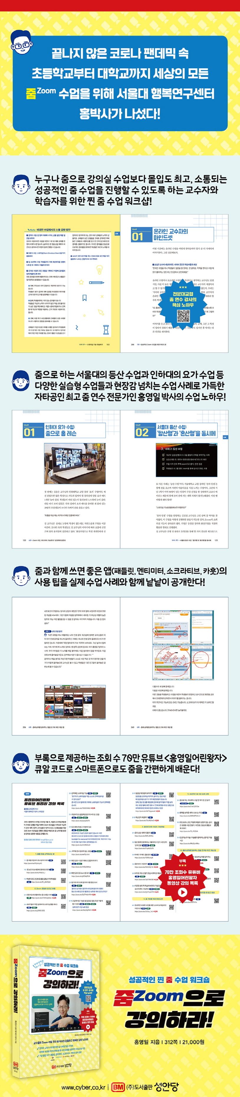 교육적 목적으로 강의자적 관점에서 줌을 어떻게 잘 활용할 것인가에 초점을 맞춘 이 책은 교수님들이나 선생님들이 입소문으로 찾던 줌 일등 연수 강사 홍영일 박사의 70만 조회수 유튜브 ‘홍영일어린왕자’의 내용을 저자 표현대로 ‘세상 쉽게’ 설명한 책이다. 부록으로 홍박사 유튜브의 목록과 QR코드를 제공하므로 책 내용으로 이해가 안 가면 바로 설명을 실시간으로 들을 수 있다.