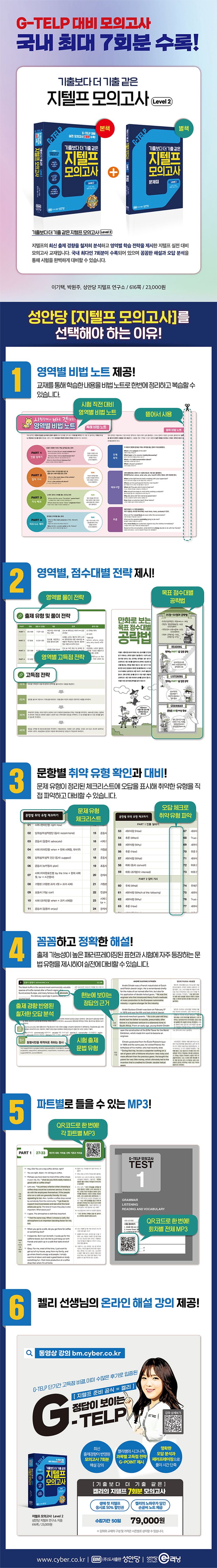 이런 추세에 맞춰 ㈜성안당에서 지텔프 시리즈로 기출문제 해설집, 기출 문법, 기출 독해, 기출 보카에 이어 실전 대비 모의고사 문제집인 [기출보다 더 기출 같은 지텔프 모의고사 Level 2]를 출간했다. 본 교재는 최근 경향을 완벽히 분석하고 반영한 모의고사 7회분을 수록해 학습량을 늘렸으며, 영역별 학습 전략과 취약 유형 체크리스트로 스스로 보완해야 할 영역을 파악하는 데 도움이 되도록 했다. 또한 청취 영역에서는 테스트 전체 음원 외에 파트별 MP3 파일을 함께 제공해 편리하게 학습하도록 돕고, 부록으로 영역별 비법 노트를 통해 시험 직전까지 학습한 내용을 정리하고 복습하도록 했다.