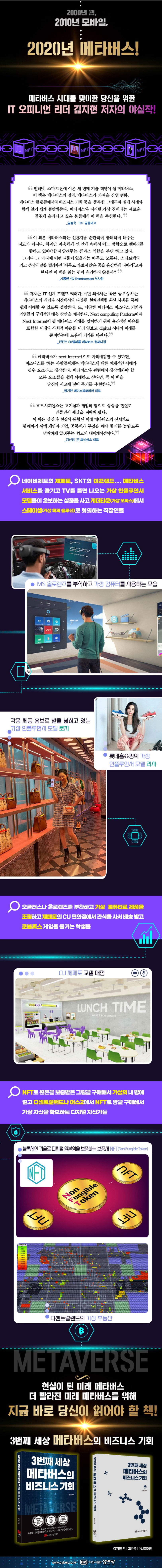 카카오택시나 우버가 택시 업계의 지각을 바꾼 것처럼 쿠팡이나 G마켓이 유통의 흐름을 바꾼 것처럼 이 책을 통해 메타버스라는 큰 디지털 플랫폼의 변화를 이해하고 대비한다면 미래는 바로 여러분의 것이다.