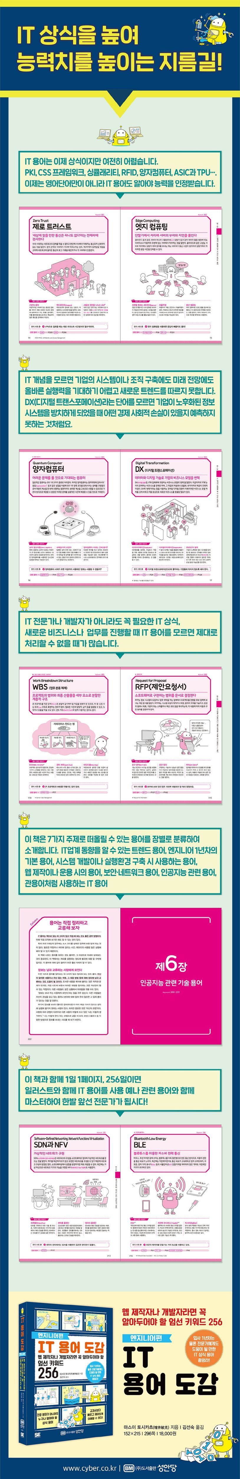 특히 IT업계 동향을 알 수 있는 트렌드 용어, 엔지니어 1년차부터 알아야할 기본 용어, 시스템 개발 및 실행 환경 구축에 사용되는 IT 용어, 웹 제작 및 운용 관련 용어, 보안 네트워크 용어, 인공지능 관련 용어 등 장별 주제에 맞는 용어들을 수록해 최신 IT 트렌드를 따라잡을 수 있어 취준생이나 현업 개발자에게 안성맞춤이다. 특히 마지막 7장은 보너스 페이지처럼 일본 IT업계에서 사용하는 관용적 표현도 수록하고 있는데 국내에서 사용되지 않는 표현은 해당 영어 표현을 상단에 병기하여 최대한 의미를 살려 이해할 수 있도록 했다.