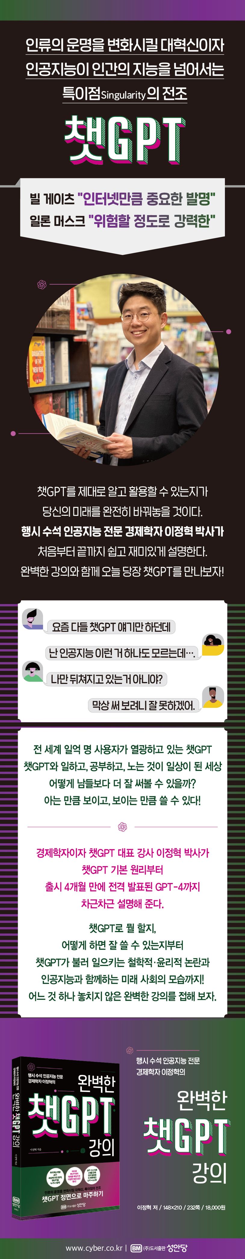 저자 이정혁 박사는 과거 정부 대표로 예산안과 세법개정안을 강의하는 유튜브 동영상을 찍었을 정도로 어려운 개념을 쉽고 재미있게 설명하는데 정평이 나 있다. 미국 박사과정 중 머신러닝을 활용한 경제 분석을 공부하던 그가, 챗GPT를 처음 접한 순간 엄청난 충격을 받고 바로 이를 온 국민에게 알릴 책을 쓰기로 결심했다. 이 책은 시중에 쏟아져 나오고 있는 다른 책들과 달리 챗GPT의 효과적인 사용법뿐만 아니라 그 경제적·사회적·철학적 함의(含意)까지 친근하고 편안한 어투로 심도 있게 조명한다. 더불어, 챗GPT 출시 4개월 만에 놀라울 정도로 업그레이드 된 최신 GPT-4 모델까지 반영한 국내 최초의 책이다. 이 책 한 권만 읽고도 독자들은 챗GPT로 무엇을 할 것인지, 어떻게 더 잘 쓸 수 있는지, 그리고 이를 통해 스스로를 얼마나 더 발전시켜나갈 수 있을지 까지 한눈에 이해할 수 있다.