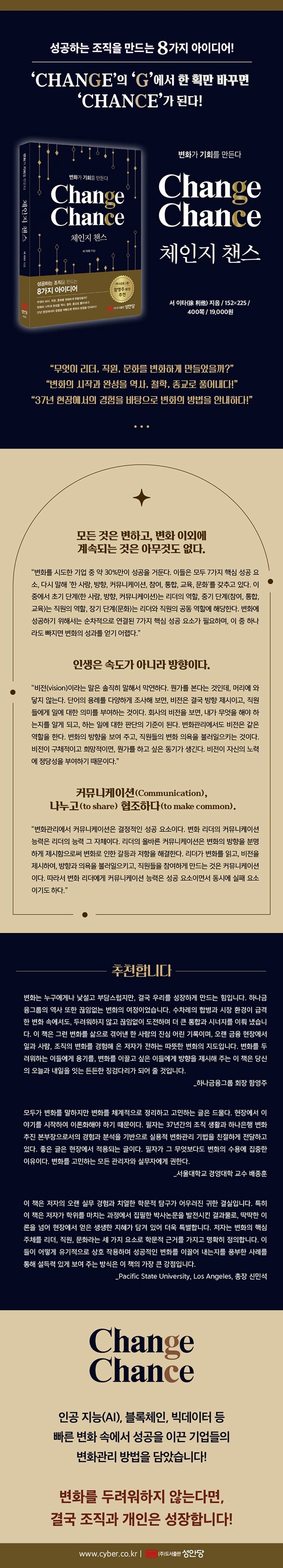 이 책은 37년간 현장에서 다양한 조직의 직원과 기업문화가 통합되고 변화하는 과정을 경험한 저자가 오랜 실무 경험과 치열한 학문적 탐구를 바탕으로, 변화의 핵심 주체를 리더, 직원, 기업문화라는 세 가지 요소로 학문적 근거를 가지고 명확히 정의하고 이들이 어떻게 유기적으로 상호작용하며 성공적인 변화를 이끌어 내는지를 풍부한 사례를 통해 설득력 있게 제시하였다.