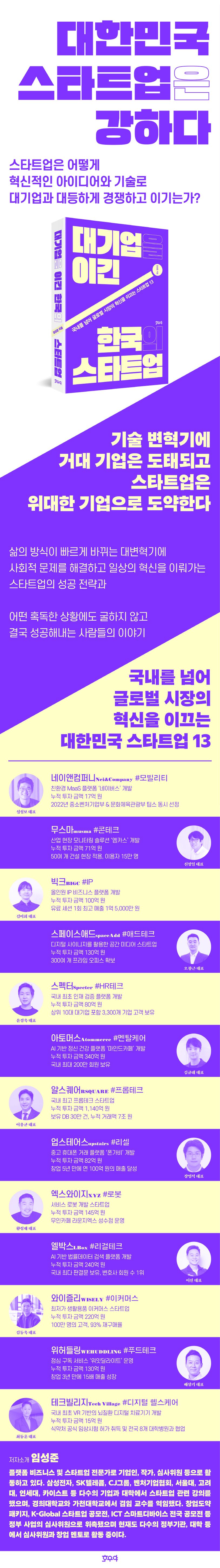 《대기업을 이긴 한국의 스타트업》은 삶의 방식이 빠르게 바뀌는 기술 대변혁기에 앞장서 사회적 문제를 해결하고 일상의 혁신을 이뤄가는 스타트업들의 이야기를 담은 책이다.