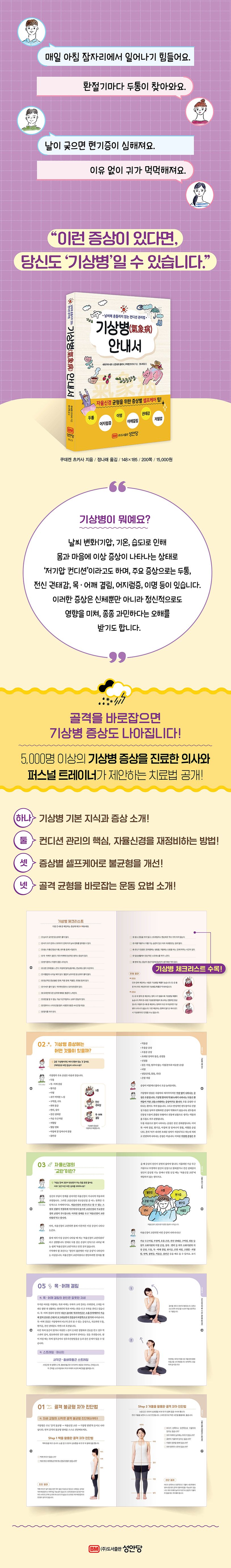 지식 편, 실천 편으로 구성되어 있으며, 1~4장은 기상병을 이해하는 데 필요한 기본 지식을 알아보고, 이와 깊은 관련이 있는 자율신경에 대해 설명한다. 5~6장은 날씨 변화로 인한 증상을 완화하는 셀프케어 방법과 골격 운동 요법을 소개한다. 쉽게 따라 할 수 있도록 구체적인 동작과 사진 자료를 제공하여, 실생활에서 스스로 관리할 수 있다. 이 책은 날씨에 휘둘리지 않고 건강한 컨디션을 유지하고 싶은 모든 이들에게 좋은 지침서가 될 것이다.