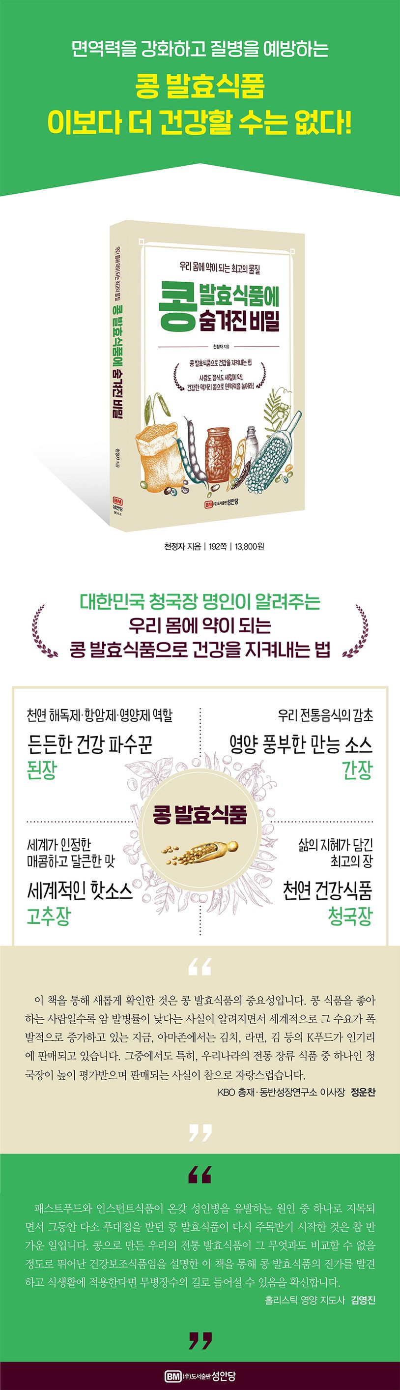 이 책은 건강한 면역력이 필수인 요즘, 건강하고 안전한 먹거리로 주목받고 있는 콩의 중요성과 함께 콩으로 만든 다양한 재래식 전통 식품의 종류, 만들어지는 과정, 특징 등을 전반적으로 소개한 콩 발효식품 안내서이다.