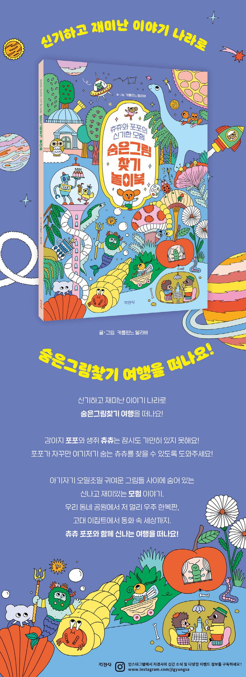 이 책이 특별한 것은 츄츄와 포포를 따라 떠나는 이야기 여행에 그치지 않고 페이지 구석구석을 살피며 숨은그림찾기를 할 수 있기 때문입니다. 어떤 이야기가 펼쳐질까 설레는 마음으로 책장을 넘기기도 하고, 어디 있을까 두 눈 크게 뜨고 숨은그림을 찾아냈을 때 느끼는 성취감 또한 크지요.