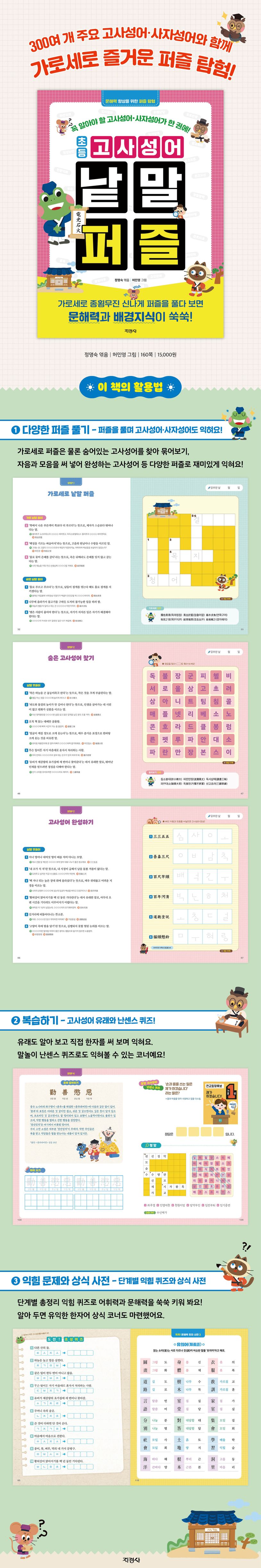 이 책은 300여 개의 주요 고사성어·사자성어를 뽑아 가로세로 퍼즐 모형에 담았어요. 글자들 속에 숨은 정답 찾기, 초성 퀴즈, 낱말 잇기 등 흥미로운 놀이북처럼 구성했지요.