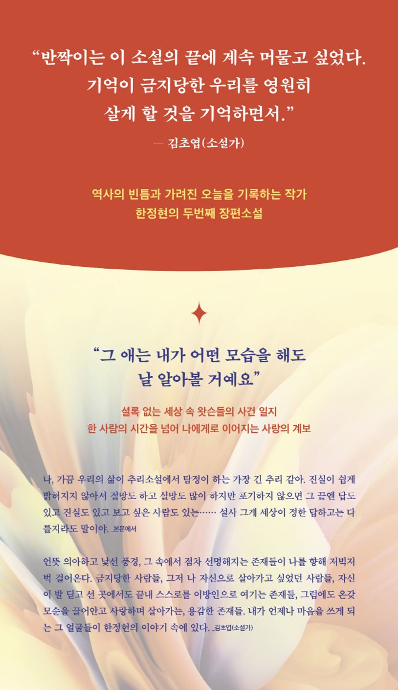 추리소설의 형식을 빌린 이번 소설은 기억을 잃은 설영과 기억을 잊지 못하는 연정이 설영의 사라진 기억 속 ‘셜록’을 추적하면서 시작된다. 단서를 찾아가는 여정에서 만나는 자신의 이야기를 가진 사람들을 통해 한정현은 공식적 역사로 기록되지 못했고 공적 제도가 구하지 못한 사람들의 이름을 가만히 부르고 눈을 맞춘다. 다시 한번, 견고해 보이는 대문자 역사의 폭력의 계보를 사랑의 계보로 대체해나가려 한다.