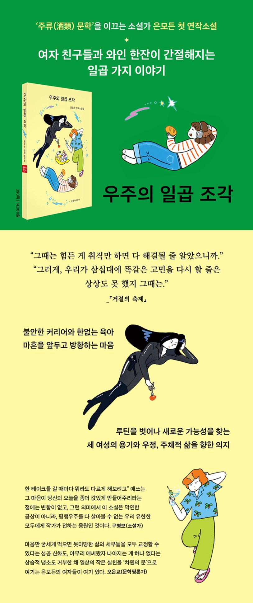 『모두가 너와 이야기하고 싶어 해』 『애주가의 결심』 저자 은모든의 첫 연작소설집 『우주의 일곱 조각』이 출간되었다. 2018년 『한국경제』 신춘문예로 데뷔한 이래 활발한 작품 활동을 이어온 작가의 일곱번째 책이다. 생생한 인물 구성과 발랄한 전개를 통해 그야말로 페이지터너의 표본을 선보인 은모든. 이번 연작은 세 명의 인물이 각기 다른 상황과 조건 안에서 새로운 가능성을 향해 나아가는 일곱 편의 소설로 이루어져 그의 특장이 빛을 발한다. 사십대가 머지않은 여성들의 방황하는 커리어, 한없는 가사노동과 육아, 확신보다는 물음으로 가득한 사랑을 둘러싼 그녀들의 이야기를 읽다 보면 여름밤 여자 친구들과 유쾌한 와인 한잔이 간절하게 느껴질 것이다. 어렵사리 휴가를 내고 비행기에 몸을 실은 당신, 지친 밤 맥주 한 캔의 위안을 찾는 당신, 익숙하게 통근 지하철에 오른 당신, 이 책에서 마음에 딱 맞는 한 조각의 이야기를 찾길 바란다.