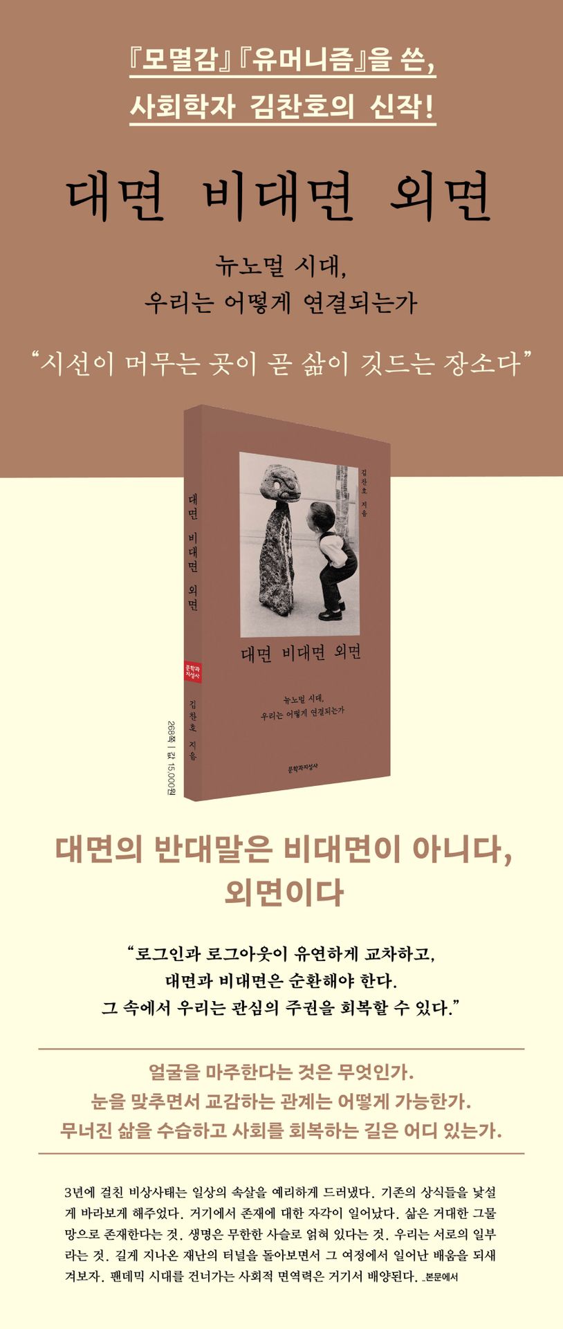이 책 『대면 비대면 외면』은 이러한 문제의식을 바탕으로 예외적 비상사태가 정상이 된 뉴노멀 시대, 바이러스와 함께 살아가거나 또 다른 감염병을 대비해야 하는 포스트 코로나 시대를 맞아 그간의 변화상을 폭넓게 조감하면서, 3년에 걸친 팬데믹이 개인과 사회에 어떤 경험이었고 그것이 남긴 여파가 무엇인지를 ‘사회적 관계’의 차원에서 되짚어본다. 인간에게 대면은 삶의 기본 값이지만 비대면 세계의 스펙트럼이 급격하게 확장되고 다채로워짐에 따라 ‘대면’과 ‘비대면’의 개념만으로는 지금의 사회적 관계를 온전히 아우르기가 쉽지 않다. 따라서 저자 김찬호는 이 책에서 ‘대면’과 ‘비대면’의 개념에 ‘외면’이라는 키워드를 추가하여 달라진 우리의 일상과 마음의 습속을 들여다보면서 개인과 개인, 개인과 사회가 맺는 사회적 관계의 기틀을 다각도로 점검한다. 포스트 코로나 시대라는 ‘가보지 않은 세계’에 들어 새삼 중요해진 면역력이 어떤 사회적 조건에서 증진될 수 있는지를 탐색하면서, 서로의 삶이 연결되는 접점과 계기를 다양하게 마련하고 사회의 토대를 새롭게 다지는 작업이 절실하다고 역설한다.