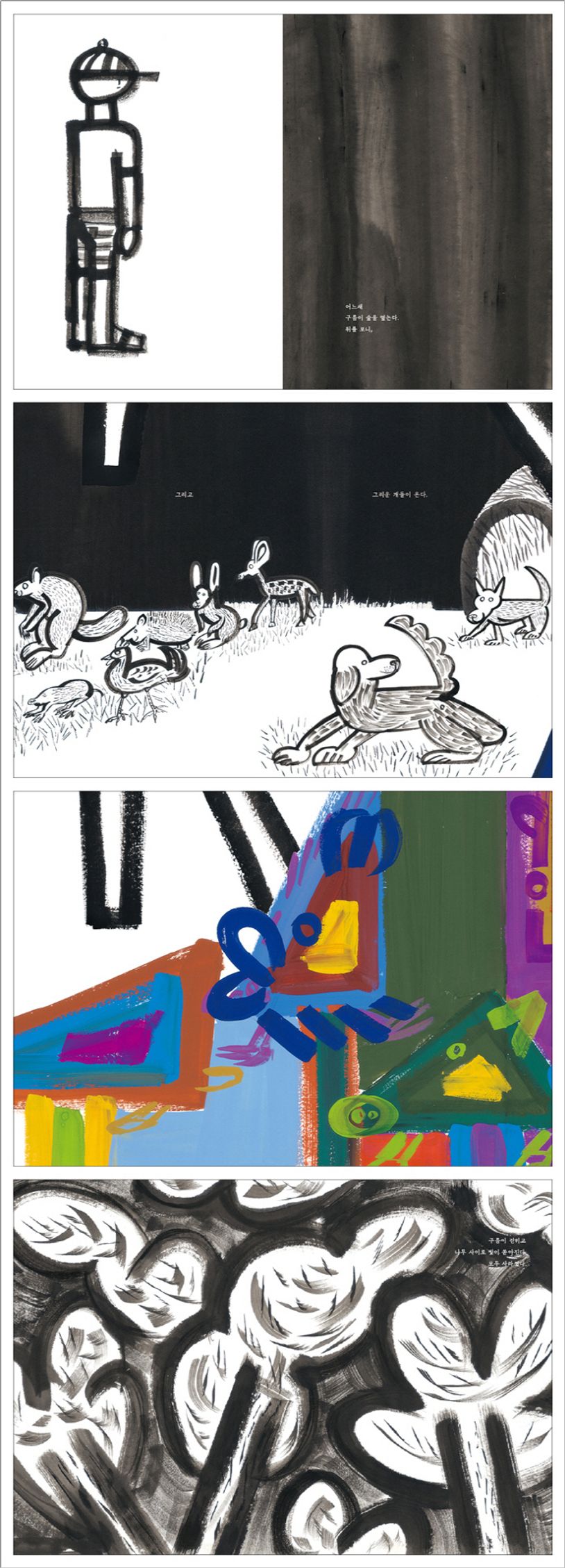 전미화 작가는 색의 대비를 통해 그리움과 상실의 이야기를 시각적으로 더욱 강렬하게 보여 준다. 사랑하는 개를 만나고 싶고, 그리워하는 장면들의 감정선은 슬픔을 누르듯 흑백의 그림들로 채워진다. 덤덤한 듯 보이지만 마음은 이미 절망의 심연이 가득 차 있다. 그 끝에서 지금은 곁에 없는 동물들이 나란히 나란히 다가오는, 병풍처럼 펼쳐지는 장면은 뭉클함과 숙연함을 동시에 안겨 준다. 흑백과 대조적으로 펼쳐지는 선명한 사계절이 연상되는 숲속의 동물들은 ‘안녕하다’라는 인사를 건네는 듯 자유로워 보인다.