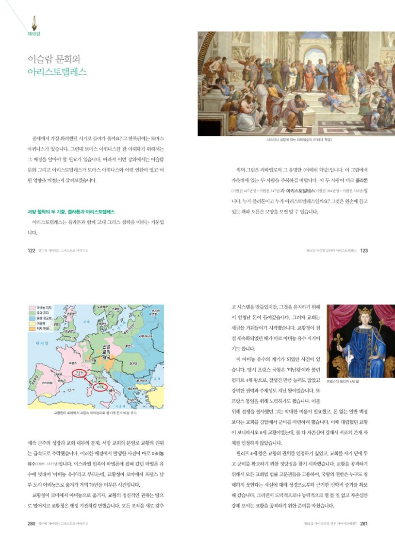 고대를 중심으로 다룬 1권에 이어, 2권에서는 카를 대제의 문예 부흥이 일어난 8세기부터 흑사병, 전쟁 등으로 혼란스러웠던 15세기까지 그리스도교라는 키워드로 중세를 샅샅이 살펴본다. 대학의 발달, 화려한 고딕 양식의 건축 등 중세의 발전된 문화를 보여 주면서, 아벨라르두스와 엘로이즈의 슬픈 사랑, 제3차 십자군 전쟁에서의 라이벌 대결, 토마스 아퀴나스가 여인의 유혹을 물리친 일화 등 흥미진진한 이야기들을 전해 준다.